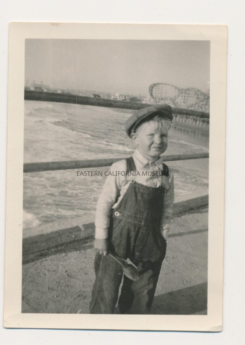 1991.13.1.125--Little boy standing in front of the ocean and what is likely Santa Monica Pier (rollercoaster in background). Photo printed by Stark Photo Service in Pomona.
