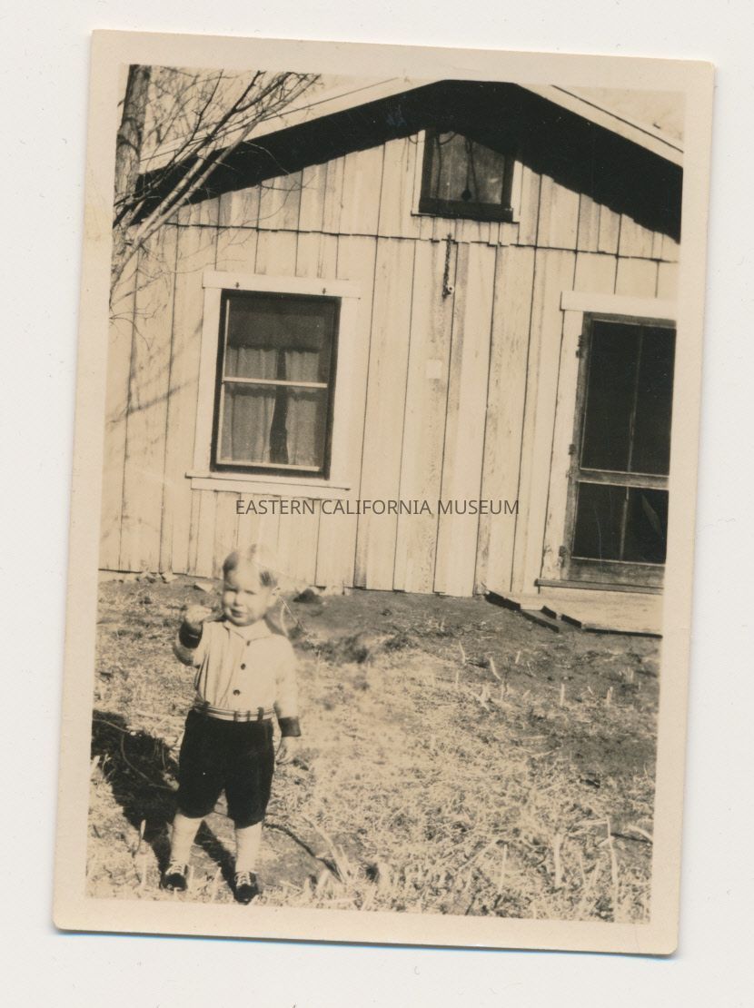 1991.13.1.132--Little boy standing in front of a wooden house.