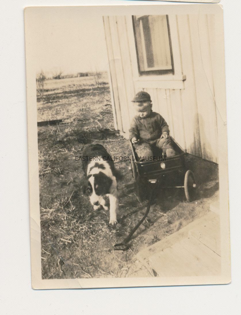 1991.13.1.137--Marvin Donald Smith sitting in a toy wagon, 1926, with dog Pete.