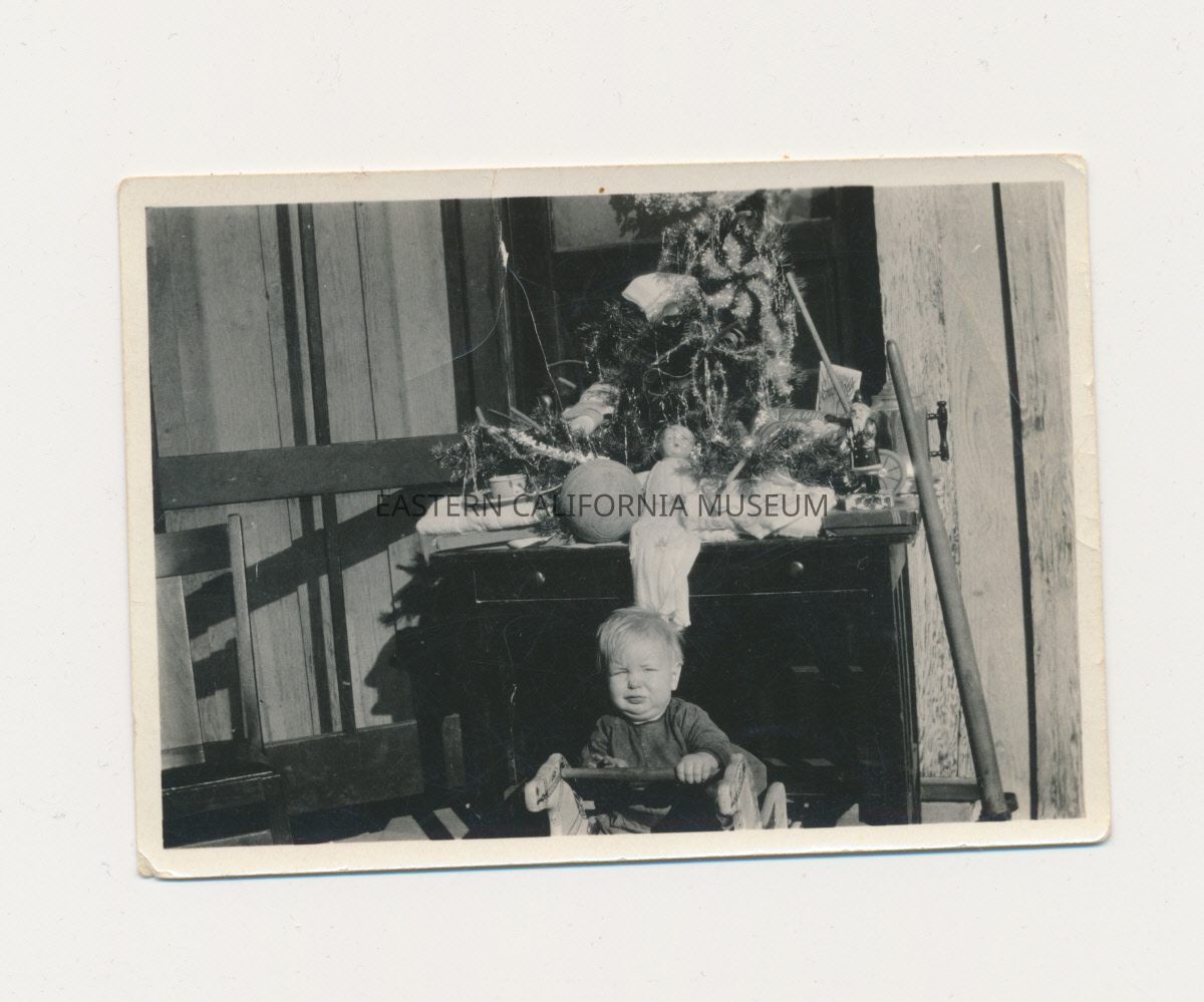 1991.13.1.139--Marvin Donald Smith, Christmas 1925. He is sitting in a rocking horse chair and there is a Christmas tree and presents behind him.