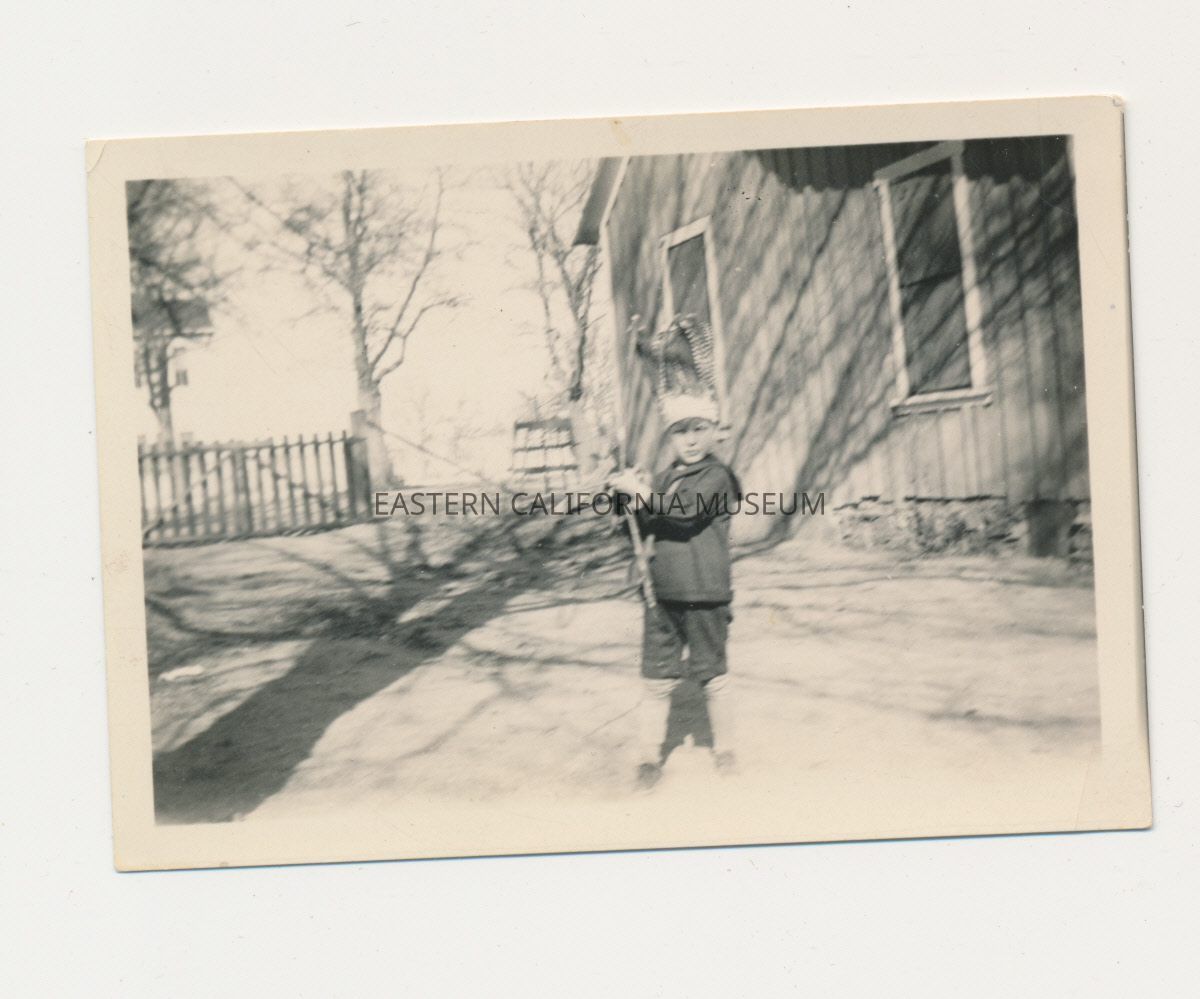 1991.13.1.140--Little boy wearing a tall, funny hat and holding a bow and arrow at Gernigan Ranch.