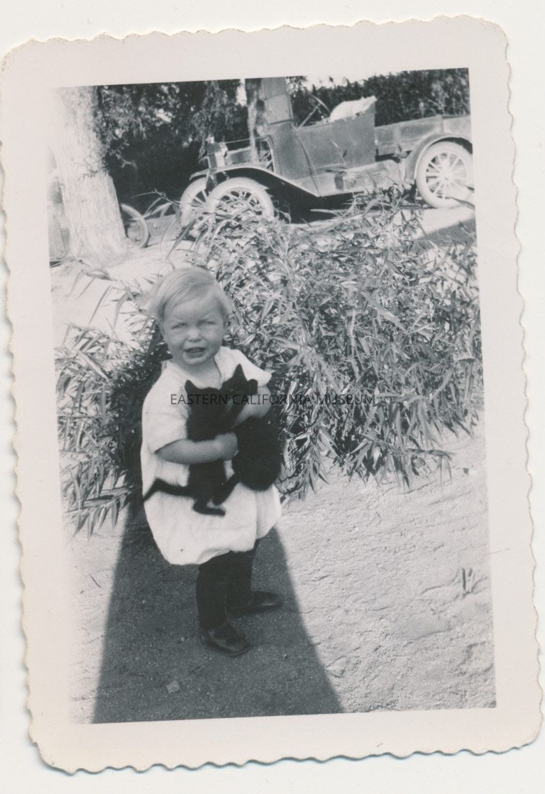 1991.13.1.127--Little boy holding two black kittens. Old vehicle with open top and pick up bed in background.