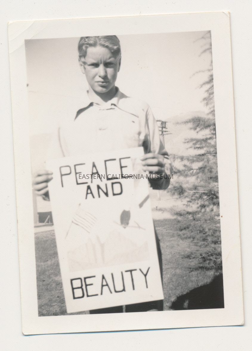 Photo of Marvin Donald Smith holding up his 1st place poster that says "Peace and Beauty" with drawings of Mt. Whitney, a flag, and an eagle. Marvin attended Lone Pine School.Collection
