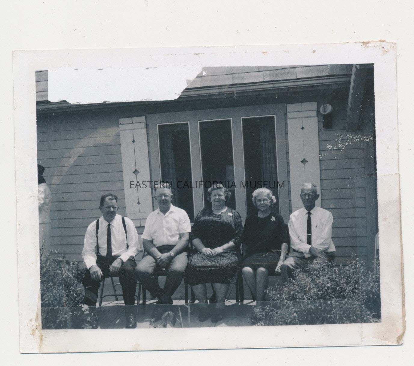 1991.13.1.205--Photo of five people sitting in front of a house. The image has flaked off in the upper left corner. Written in blue ink on reverse: August 2, 1965 in Pasadena: Dale Drew, Don Drew, Ora Drew Smith, Nellie Drew Hilliard, Claude Drew.
