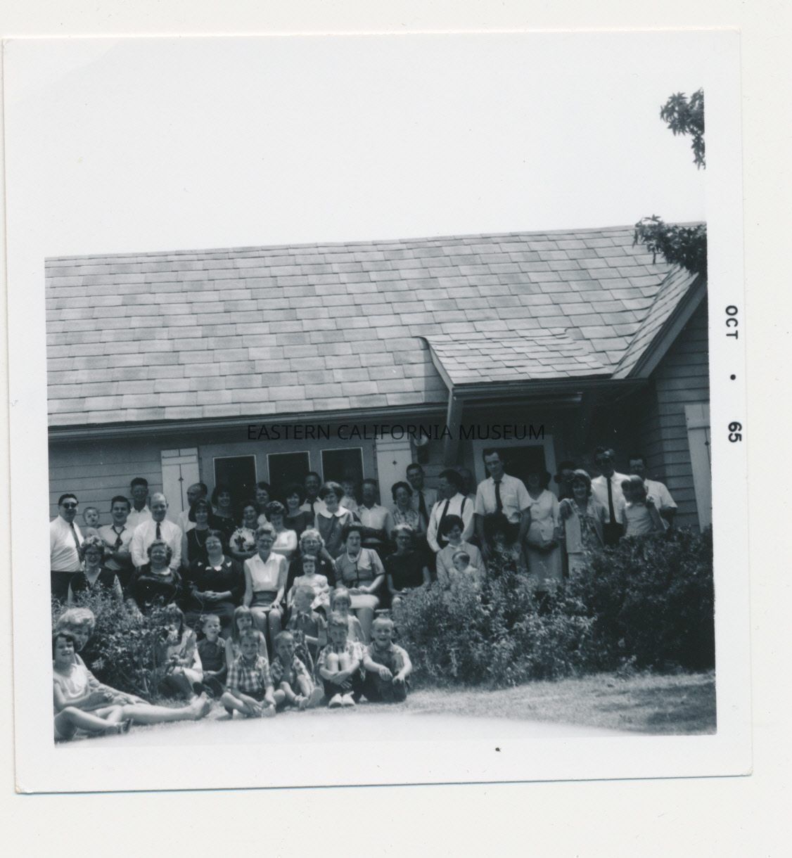 1991.13.1.206--Photo of a large group of people in front of the same house. The photo was printed in October 1965. The attendees are identified on a separate piece of paper: (LtoR back) V. Dale Smith, David Drew with baby, Marvin Donald Smith, unknown, Illie Dorsett, Mary Drew Aseltine, Carol Dorsett, Mary Drew, Ivey Chesney (?), Clarisse Smith, Diane Adcock, unknown, Linda Milton, Don Drew with baby, Zelma Drew, Dale Drew Jr., Dale Drew, Claude Drew behind Dale Drew, Ron Chesney, unknown, Mayme Drew (only top of head showing), unknown, unknown, unknown, Keith D. Drew. Seated are Thelma King, Ora Smith, Elodie Drew, Virginia Dorsett, Nellie Hilliard (child Tamera O'Harra?), unknown, Billie Milton, Virginia O'Harra holding Auu O'Harra. Seated on ground are unknown, Rita Mae Dorsestt, another Dorsett (?), Deanne Aseltine, Gerald Adcock, Debbie Drew, Michael Adcock, Loni Adcock, Mark Smith, Roland Smith, Robert Smith, David Aseltine.Collection