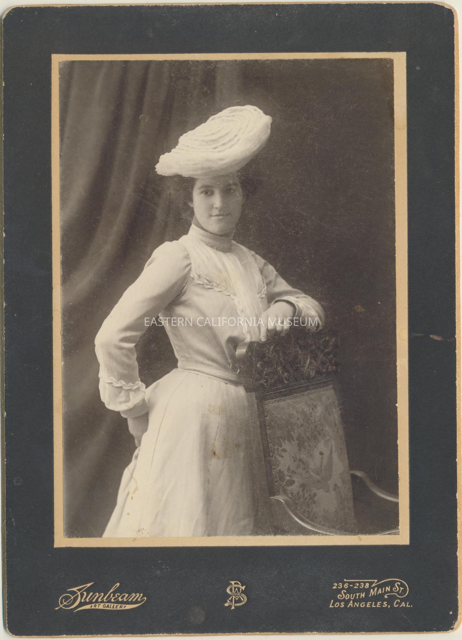 Mounted studio portrait of Mamie Reynolds of Independence. She is wearing a light colored dress and a large round white hat. The photo was taken by or at Sunbeam Art Gallery of Los Angeles.Collection