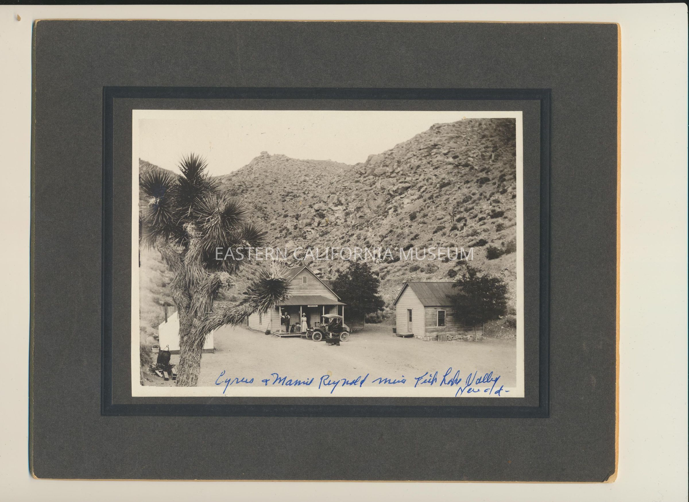 Mounted photo of the private mining camp of Millspaugh. Someone has erroneously labeled it in blue ink across the bottom, "Cyrus and Mamie Reynold mine, Fish Lake Valley, Nevada." It shows a man and woman (and dog) standing on the front porch of the Post Office with a vehicle parked in front. A second building is to the right, and on the left hidden behind a yucca tree is a white tent-like building.