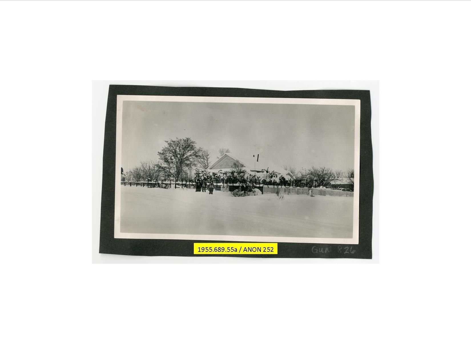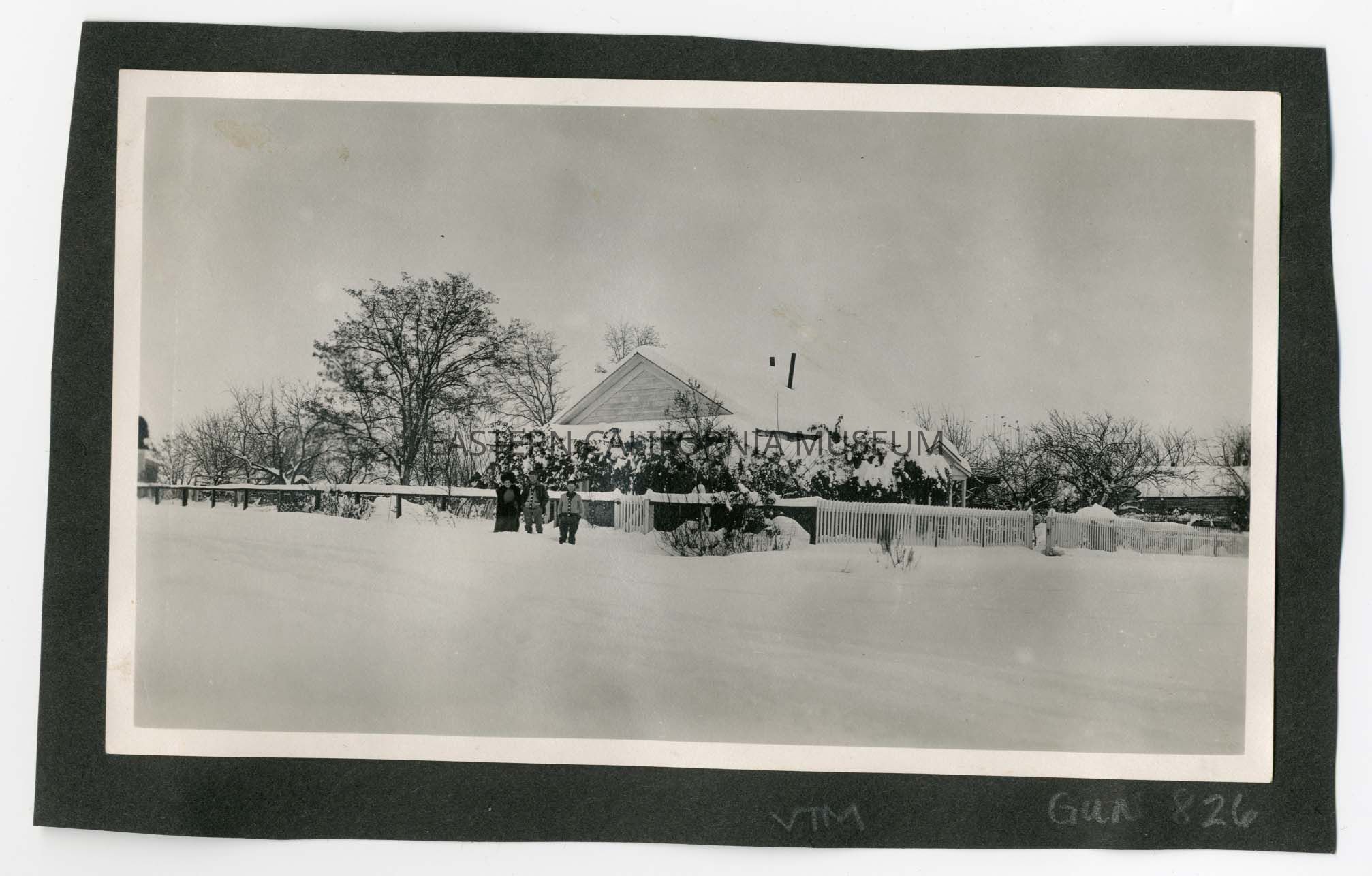 Photo of three people standing in front of a house blanketed under snow. It is identified as the Dehy house in Independence. Same image as A1831.3.22b.