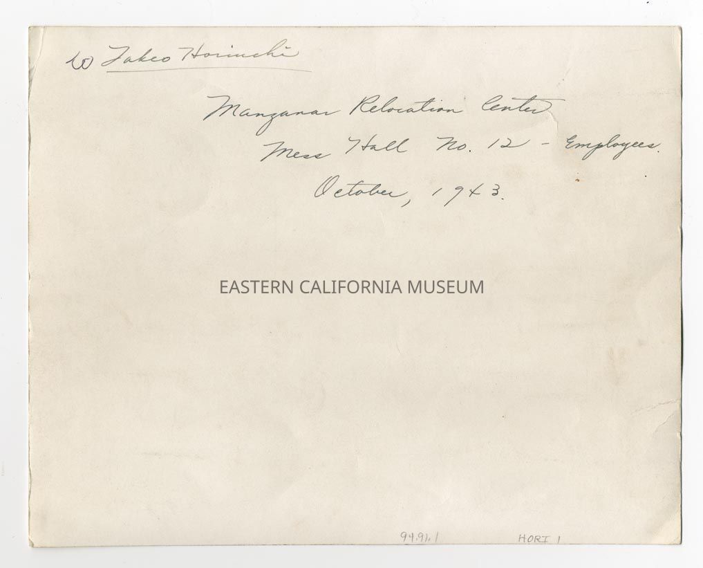 Written in in black ink on reverse: To Takeo Horiuchi, Manzanar Relocation Center, Mess Hall No. 12 - Employees, October, 1943.Photograph Details