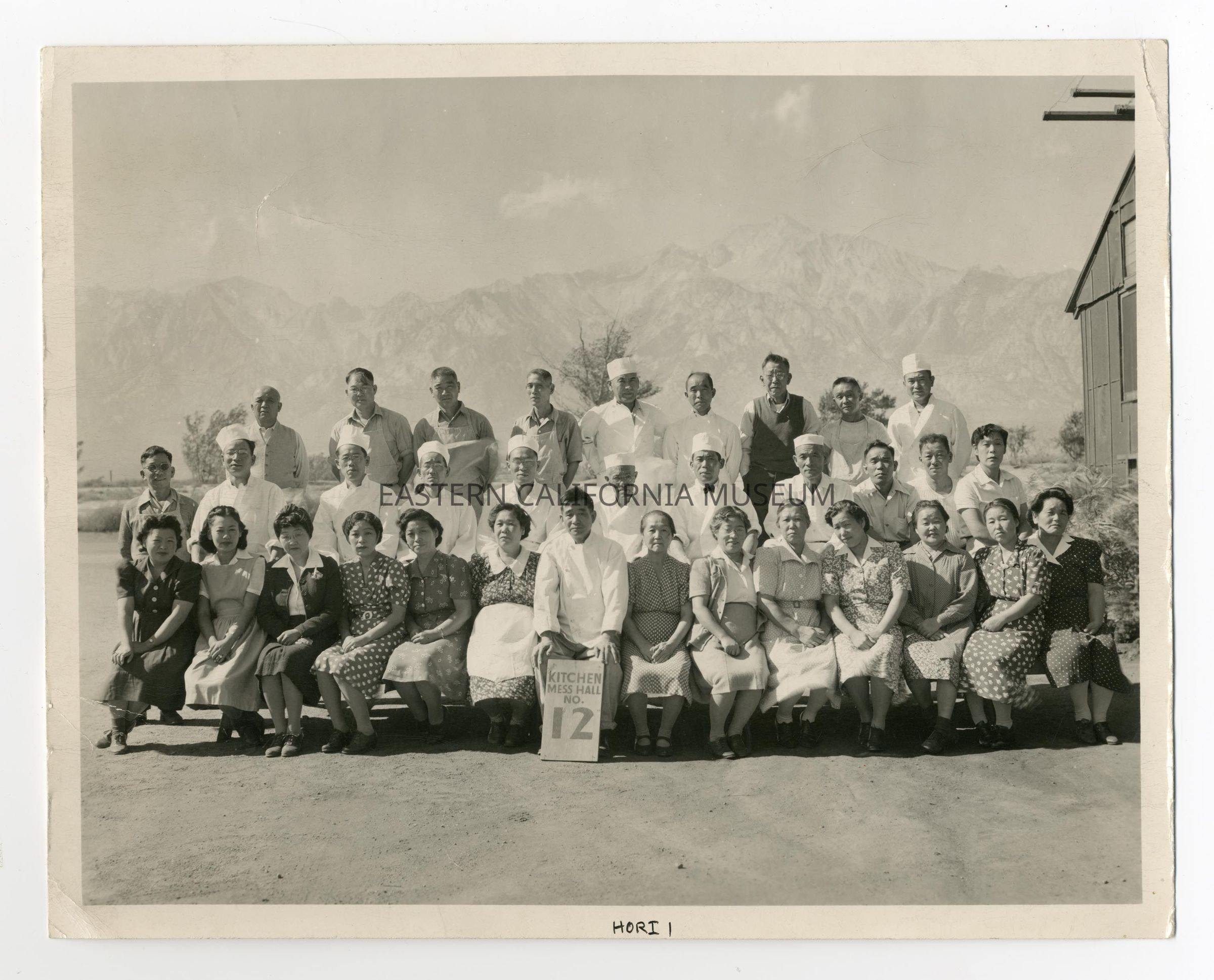Exterior photograph of 34 men and women in 3 rows. The front row is seated, and a man in the middle of the front row is holding a sign that says "KITCHEN MESS HALL NO. 12". Label beneath photo says "BLOCK 12 MESSHALL CREW." Some of the men are wearing white jackets and white hats as part of a cook's uniform. The Sierra Nevada are visible in background.
