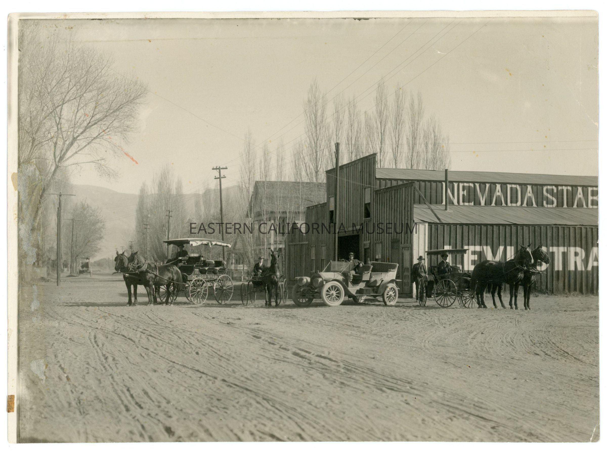 Photo of the Nevada Stables with three horse drawn conveyances (one is a stage, one looks like a buggy, and the third is difficult to tell) in the dirt street in front of it and one motorized vehicle. There is an advertisement for Levi Strauss painted on the side of the building, and there is a two story building behind it. There are poles and lines, but unknown if they are for power, telegraph, telephone, or other.