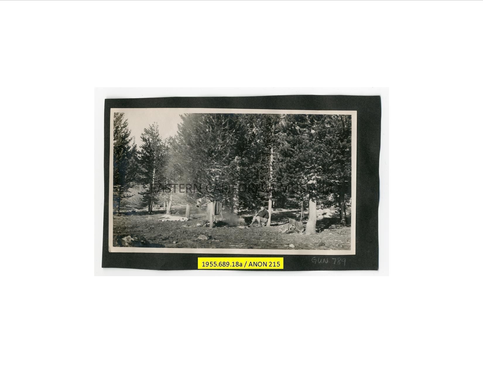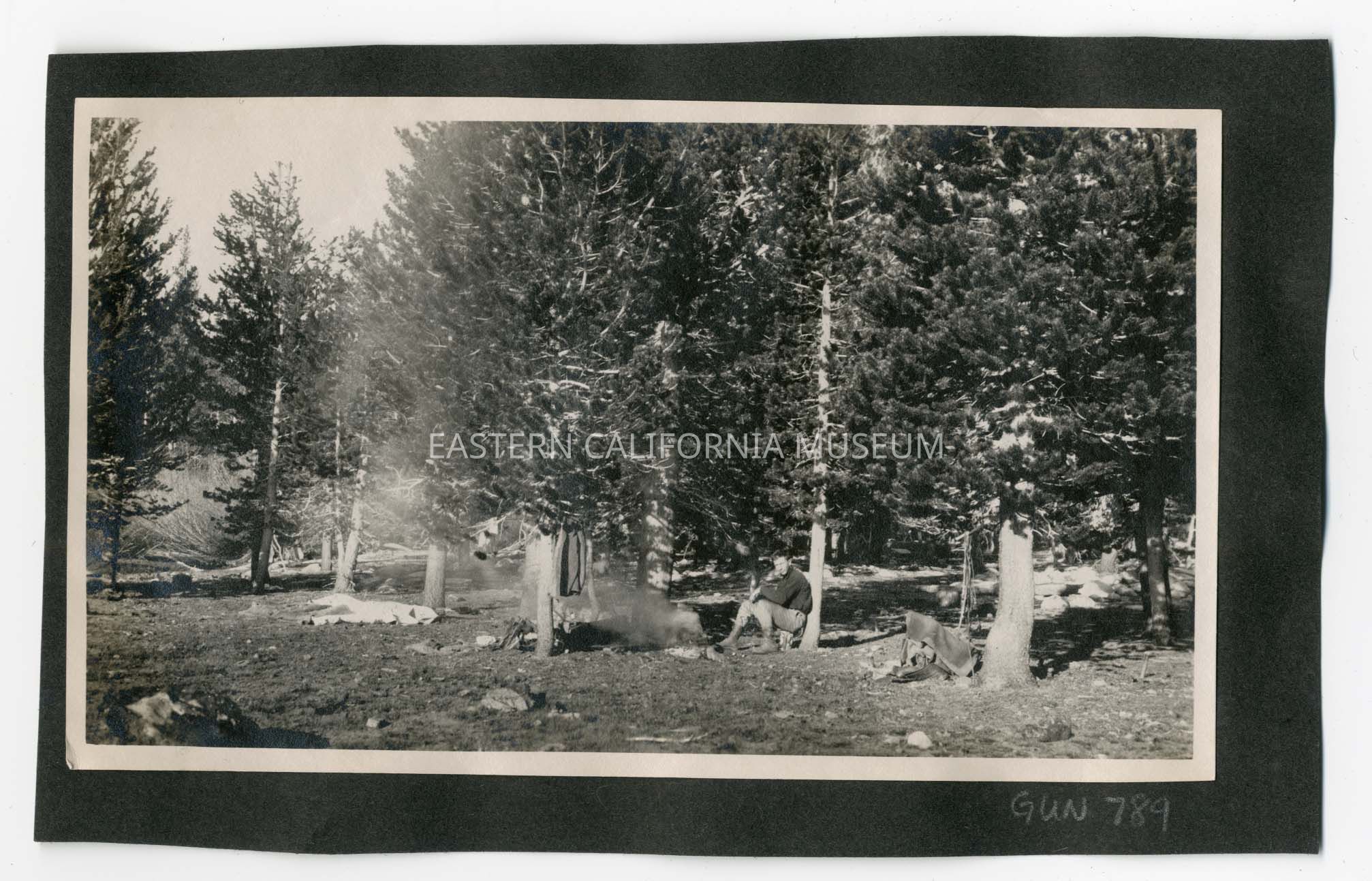 Photo of a man sitting at a campsite in a forest.
