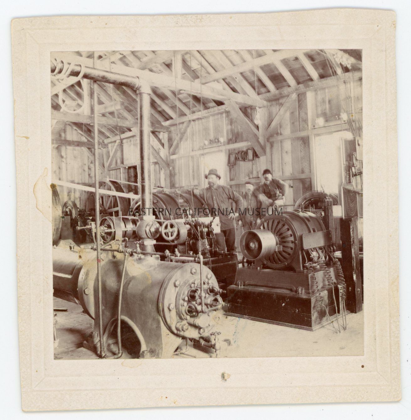 Photo of the interior of the May Lundy Mine Power House. There are three man standing amongst the equipment. Photo is affixed to a mat advertising Henry Kahn and Co. of San Francisco. Possibly taken circa 1900.
