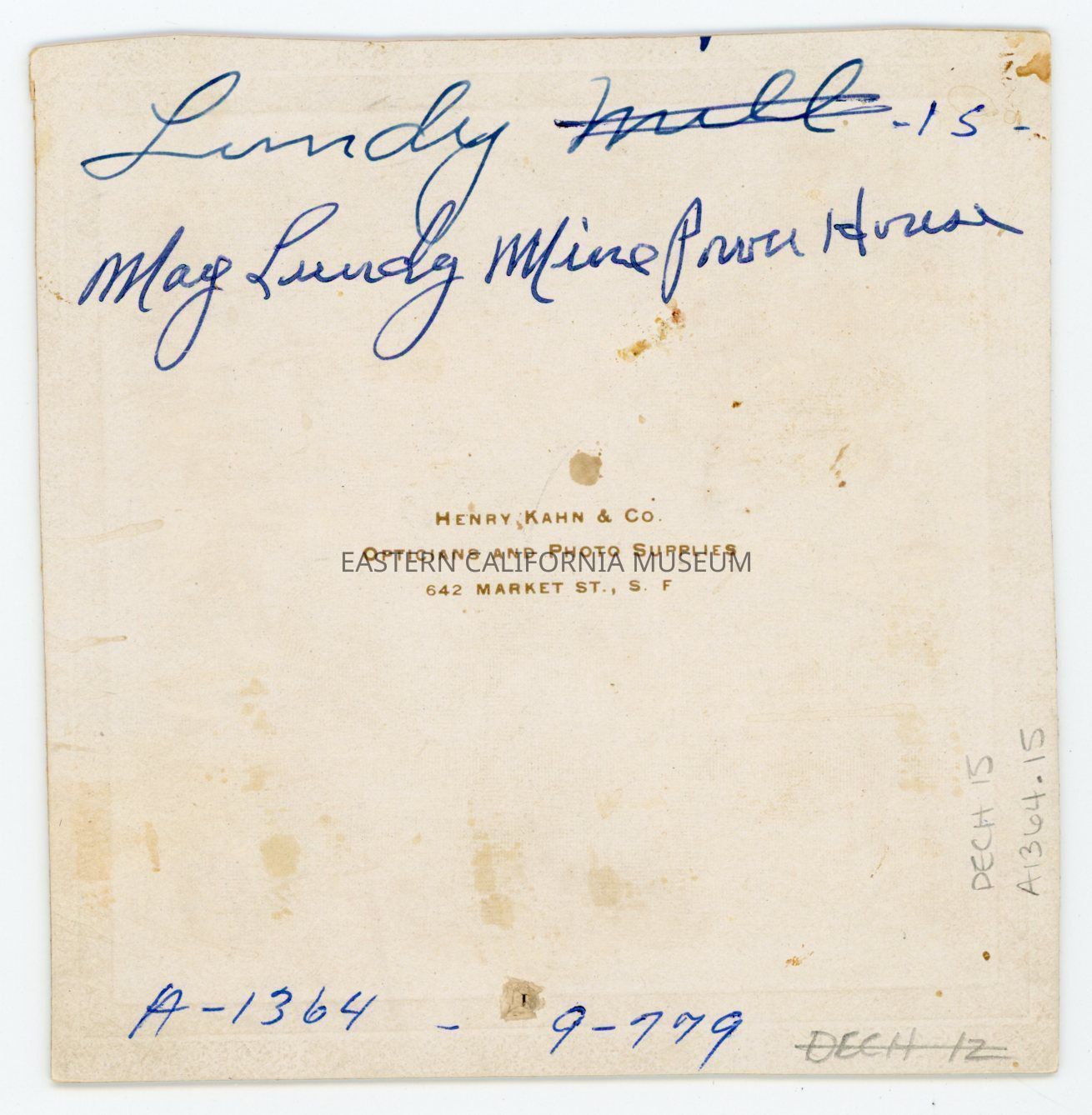 Written in blue ink on reverse: Lundy [Mill--crossed out]. May Lundy Mine Power House.Photograph Details