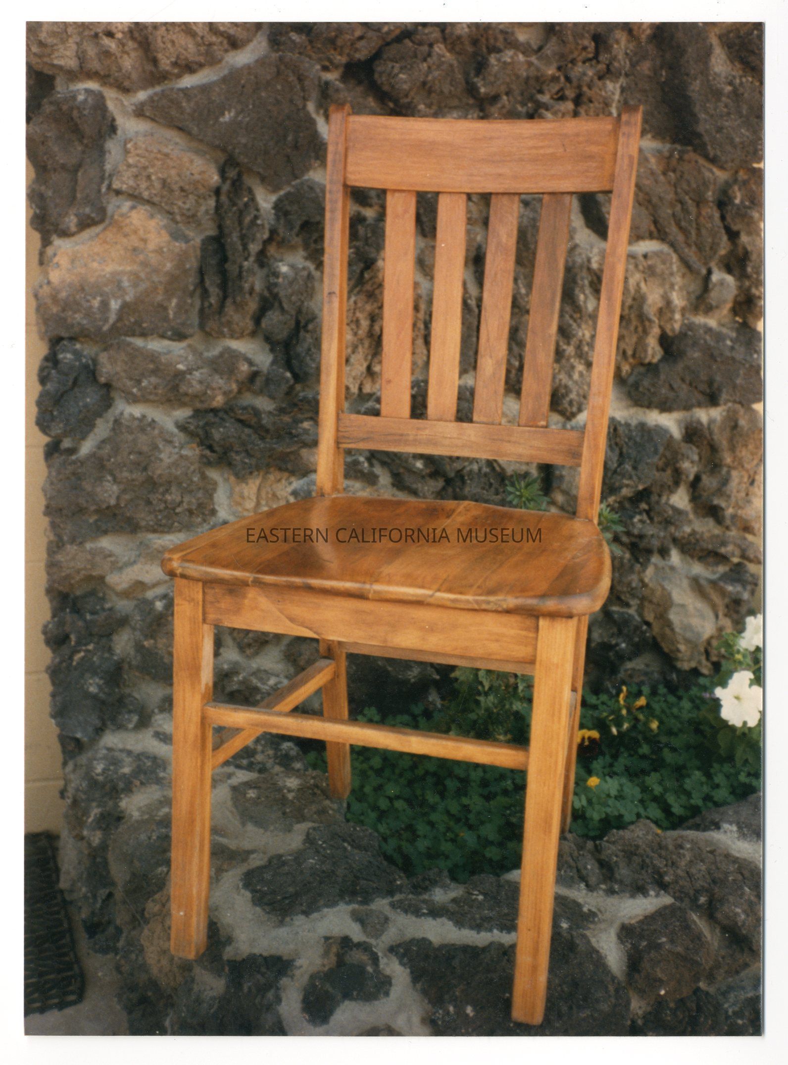 Color photo of a wooden chair that was made at Manzanar War Relocation Center. It is placed on the lava stone planter at the entrance of the museum. It appears to be 1971.12.3.