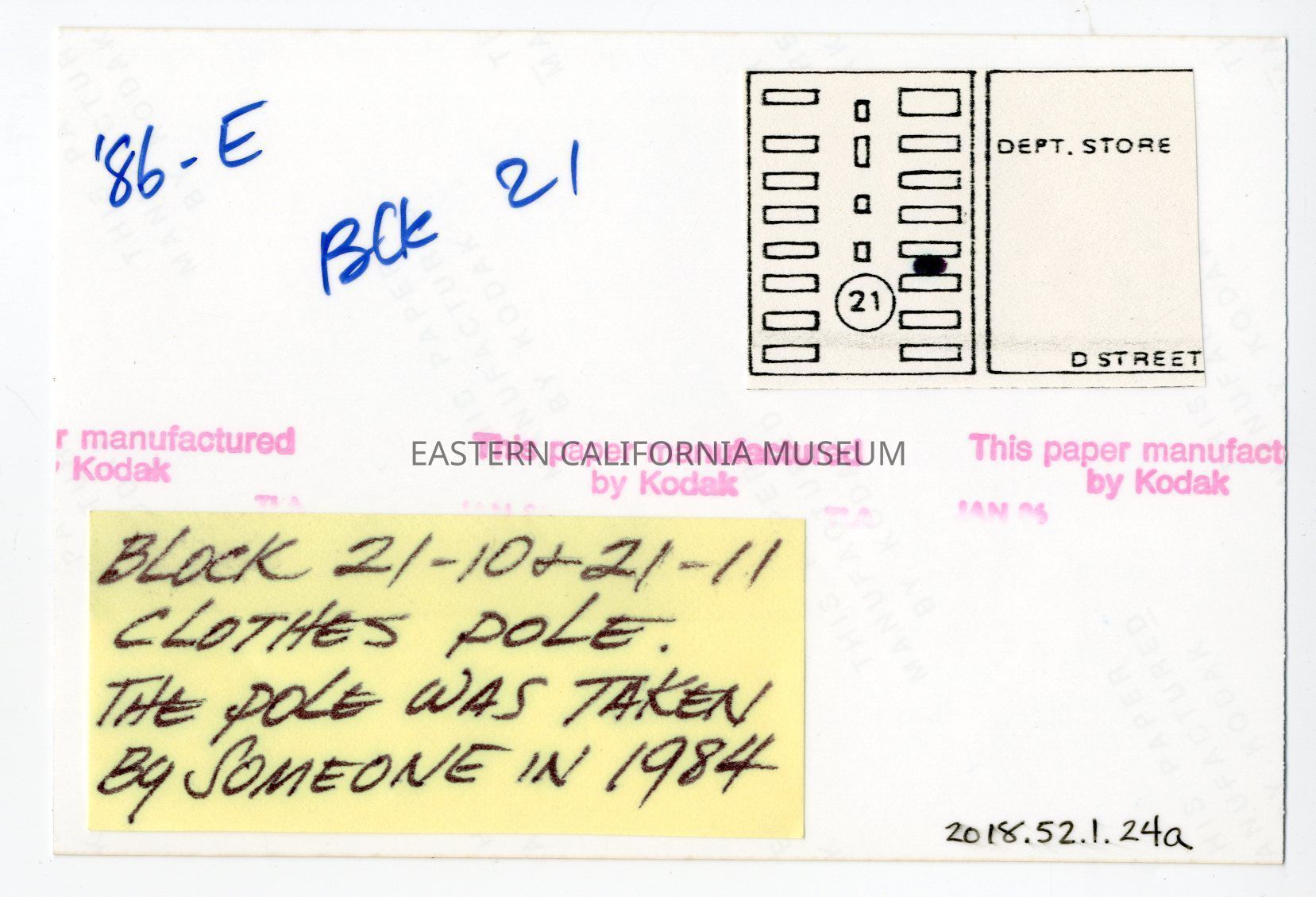 Label: Block 21-10 and 21-11 clothes pole. The pole was taken by someone in 1984.