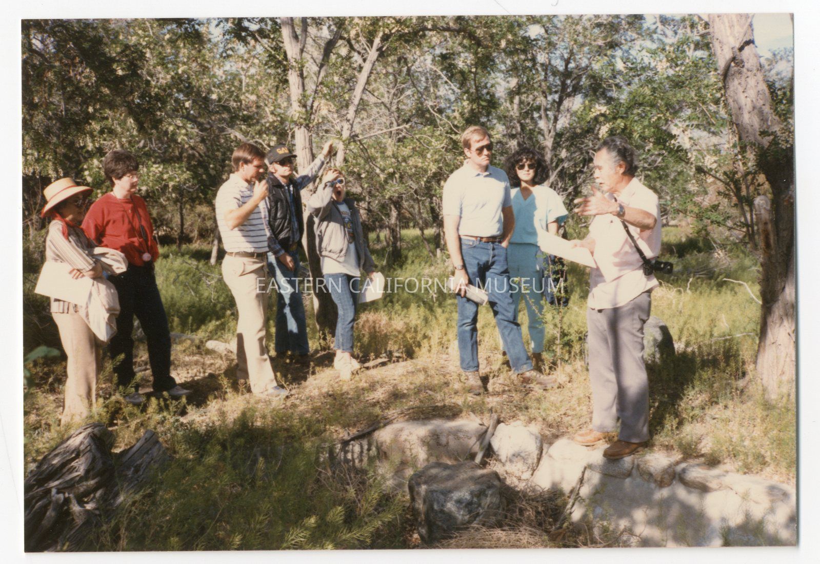 Color photo of Shi Nomura leading a group of people on a tour at Manzanar.