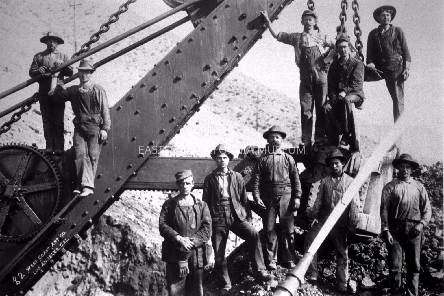 B & W digital scan of LADWP Steam Shovel Crew (numbering ten) standing on or next to Shovel Boom. Location unknown