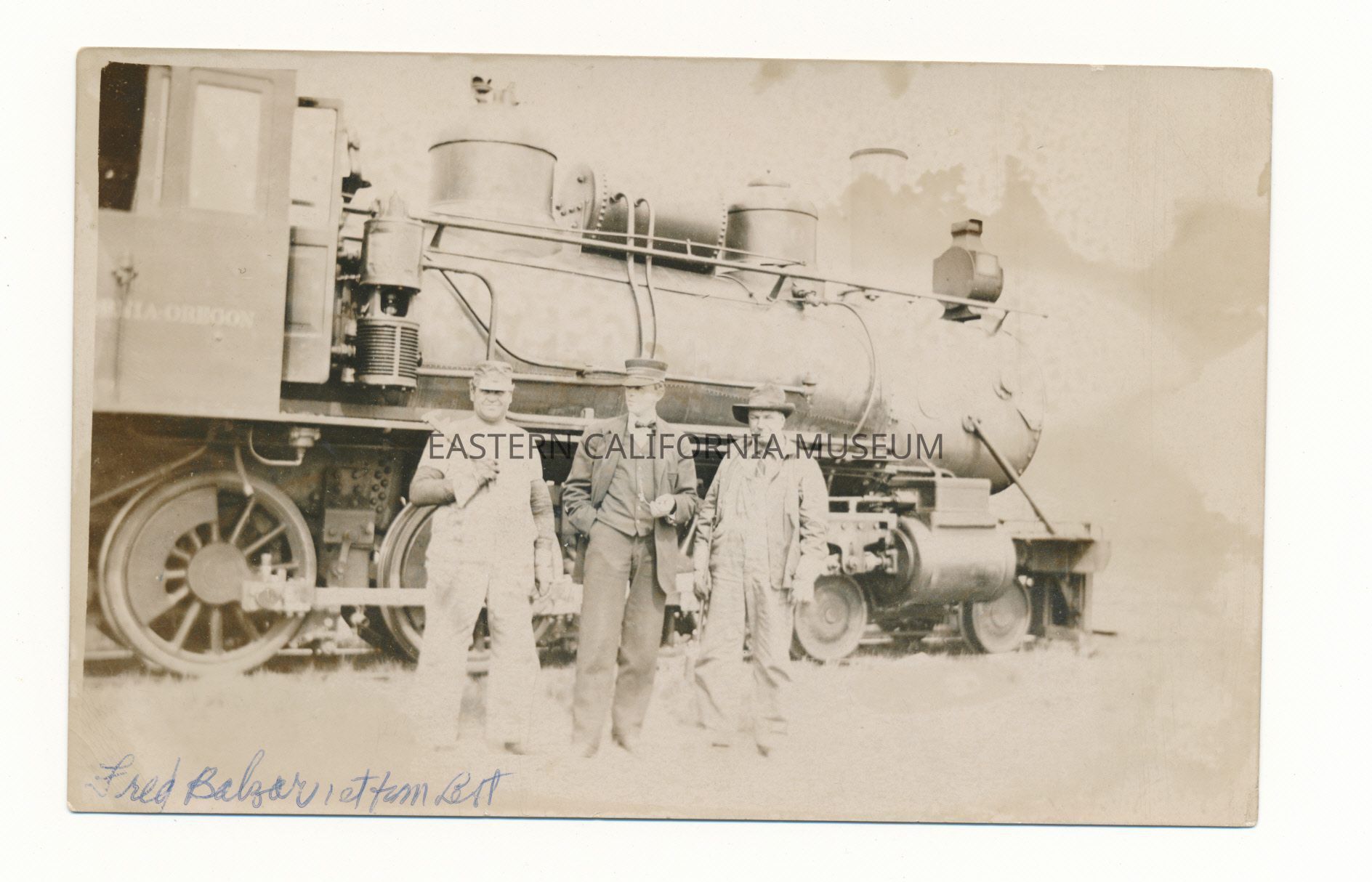 Photo postcard of three men standing in front of a NCO [Nevada-California-Oregon] engine. Written in blue ink at bottom is, "Fred Balzar 1st from left." Frederick Bennett Balzar went on to become the 15th Governor of Nevada from 1927-1934.
