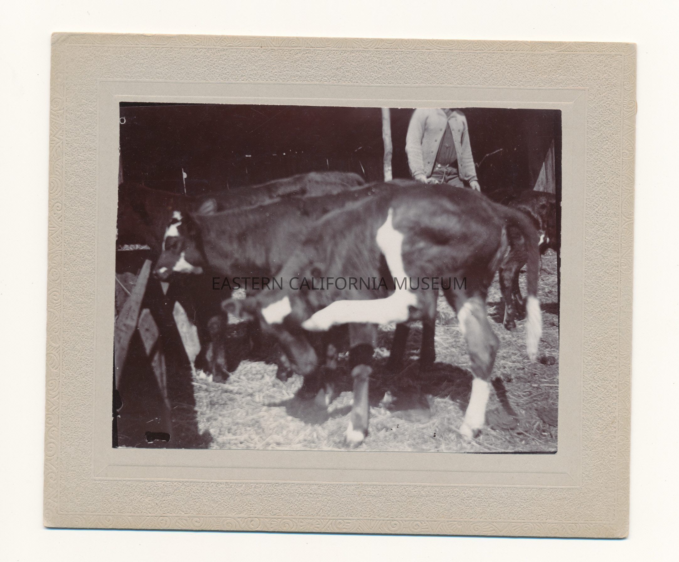 Mounted photo of cows with a man standing behind them. Written in blue ink on reverse: Calves at Calvert Ranch.