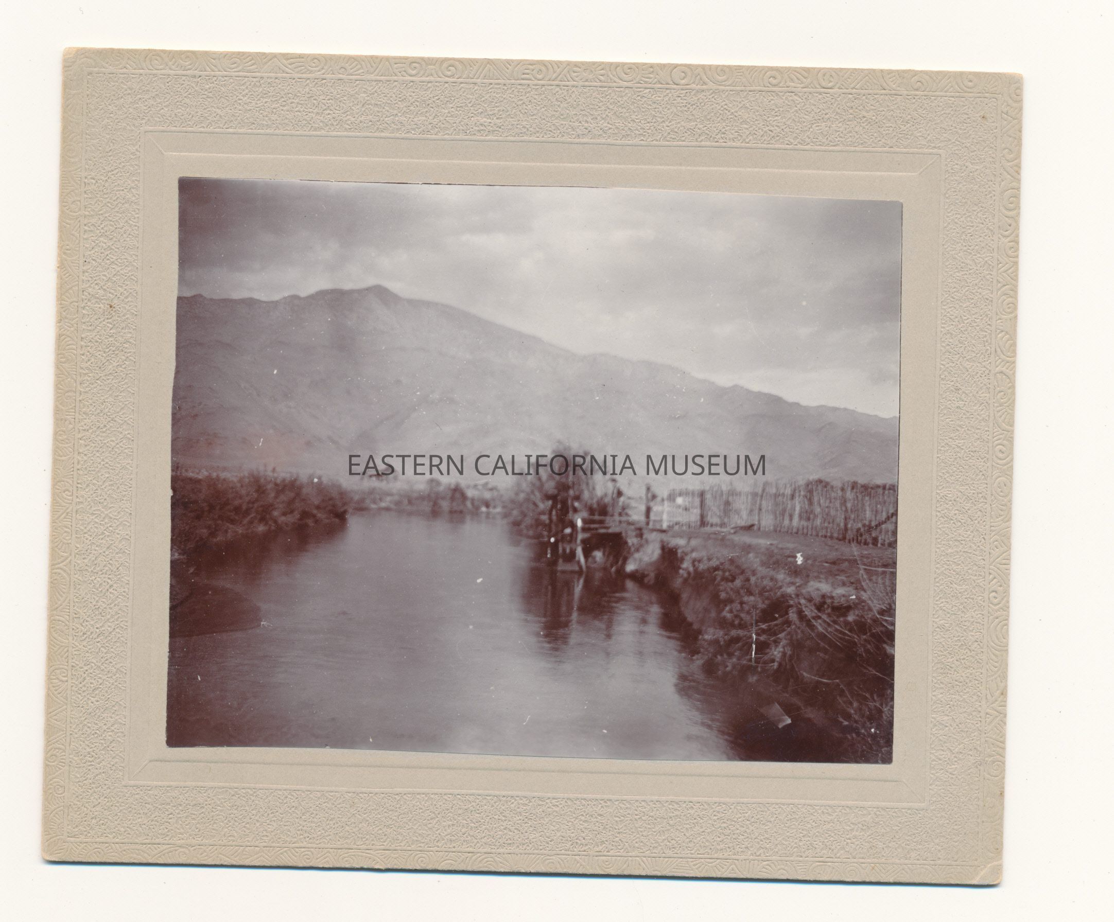 Mounted photo of the Owens River with the Inyo Mountains in the background. There is a water wheel on the right side of the river.