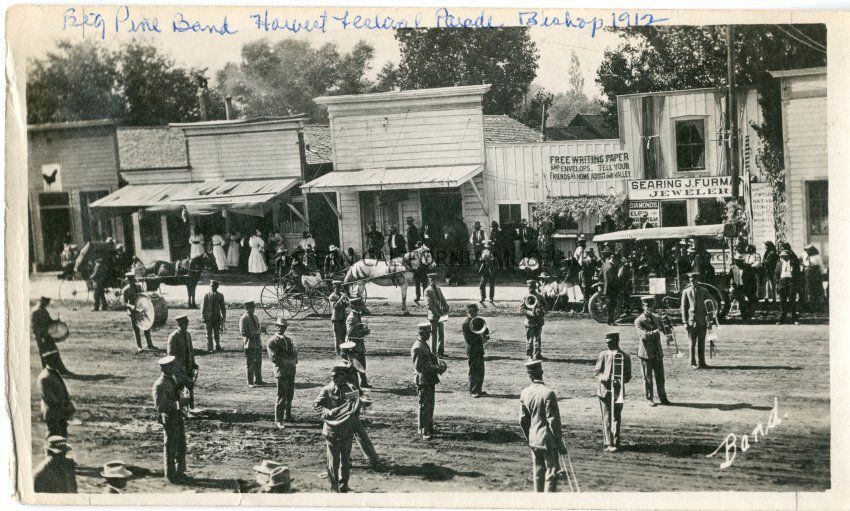 Photo titled, "Band." It shows members of a marching band standing in the the middle of a dirt road. There is a row of buildings on the opposite side of the street, one of which is "Searing J. Furman, Jeweler." Another store advertises "Free writing paper and envelops. Tell your friends at home about our valley." A third store has a sign of a chicken or rooster. There are two horse-drawn wagons or buggies and one early automobile parked on the far side of the street. Written in blue ink on top of photo is, "Big Pine Band, Harvest Festival Parade, Bishop, 1912."