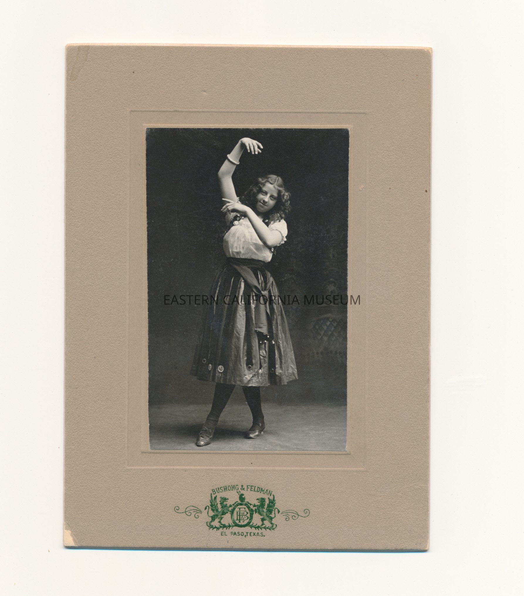 Mounted full length studio portrait of Nettie Irwin in a dance pose. The photographer was Bushong and Feldman of El Paso, Texas.Collection