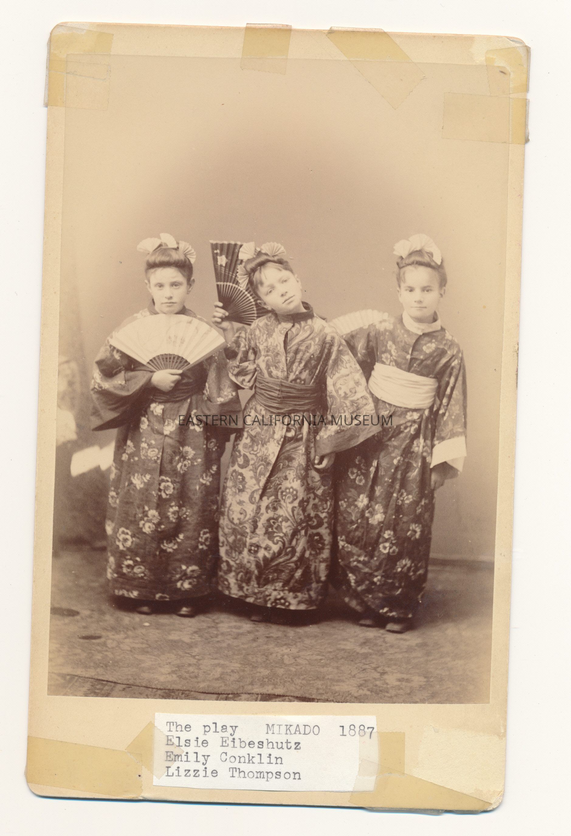 Mounted photo of Elsie Eibeshutz, Lizzie Thompson Bunney, and Emily Conklin in costume (kimonos and fans) as the "Three Little Maids" from the play "Mikado" in 1887. The photographer was Jas. H. Crockwell of Salt Lake City, Utah. A typewritten paper affixed below image says, "The play Mikado, 1887. Elsie Eibeshutz, Emily Conklin, Lizzie Thompson."Collection