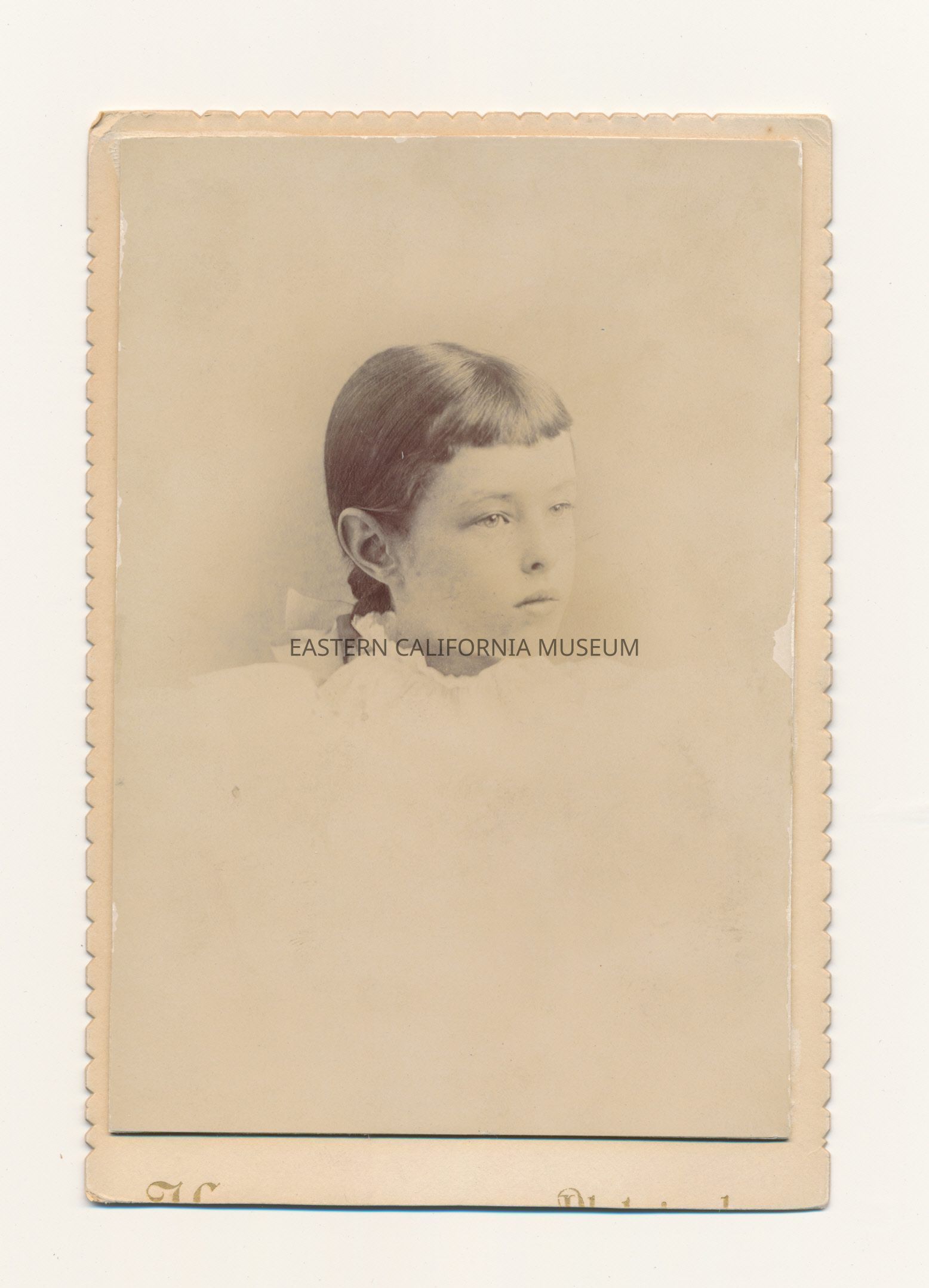 Mounted studio portrait of Irma Webb. The mount was trimmed along the bottom edge and the photographers name cut off, but it is likely the photographer was Hawes. This photo appears to have been cut from a cabinet card and mounted on another piece of cardstock (very thick).