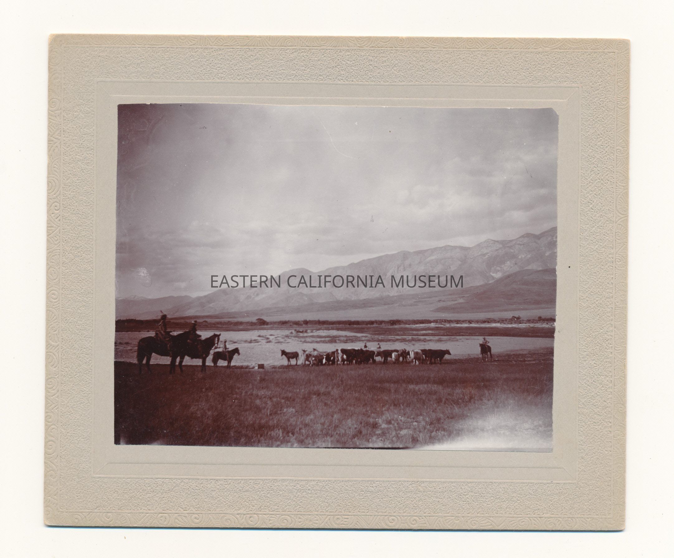 Mounted photo of cattle and cowboys in the Owens Valley. There is a body of water that the cattle are all gathered near. There are four to six people on horseback.