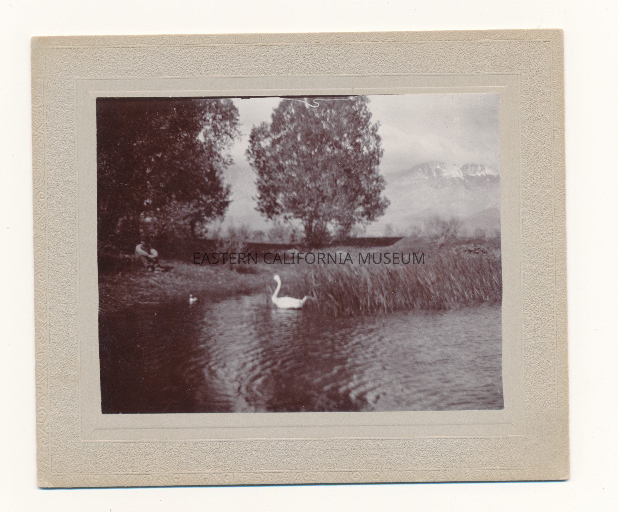 Mounted photo of a man sitting on the bank next to a body of water. There is a swan or goose in the water and mountains in the background.