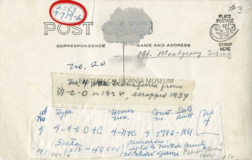 Written in pencil on reverse: Mt. Montgomery Siding. No. 4 was transferred from NCO in 1928, scrapped 1934.