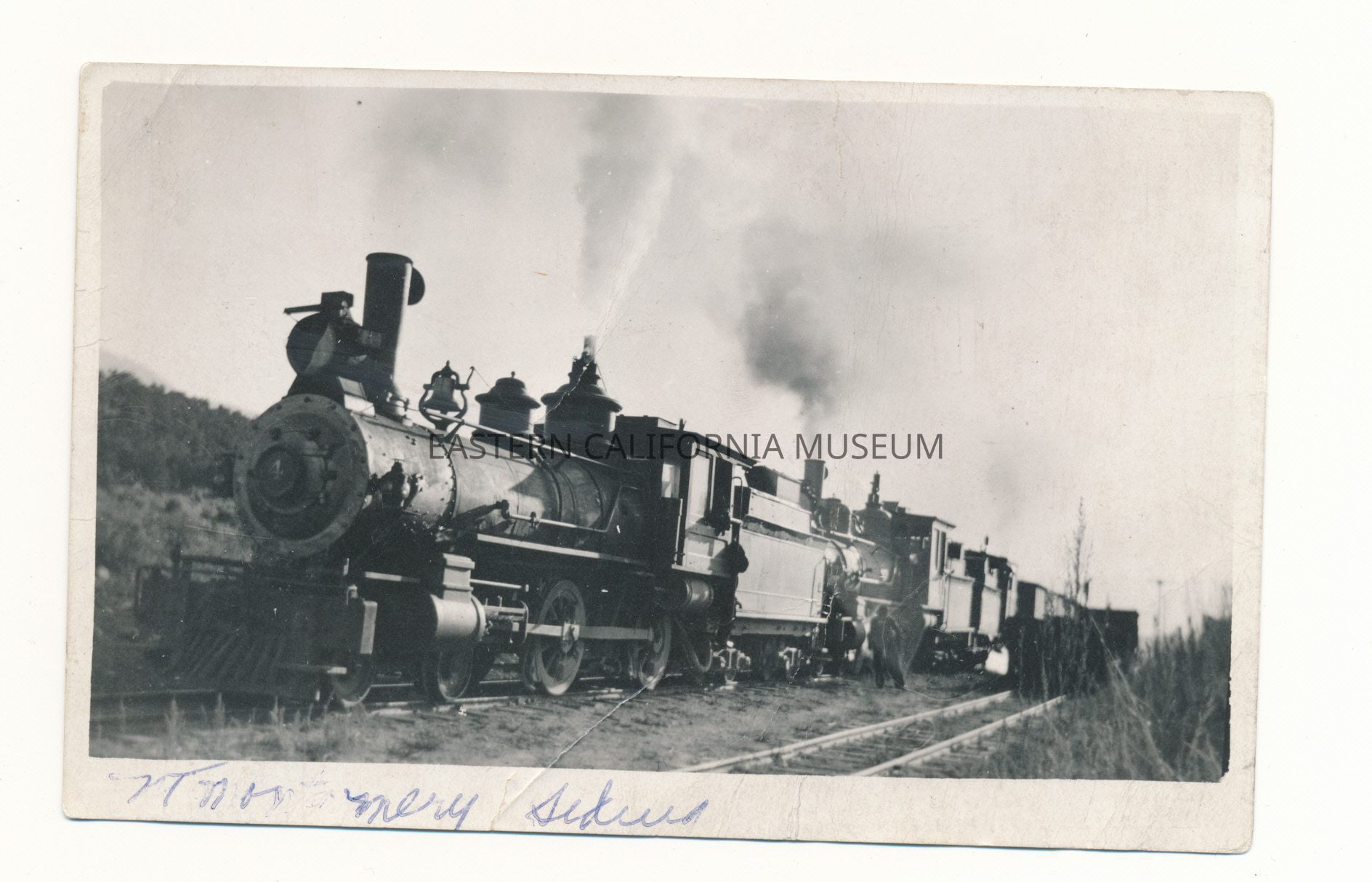 Photo postcard of engine #4 at Mt. Montgomery siding.