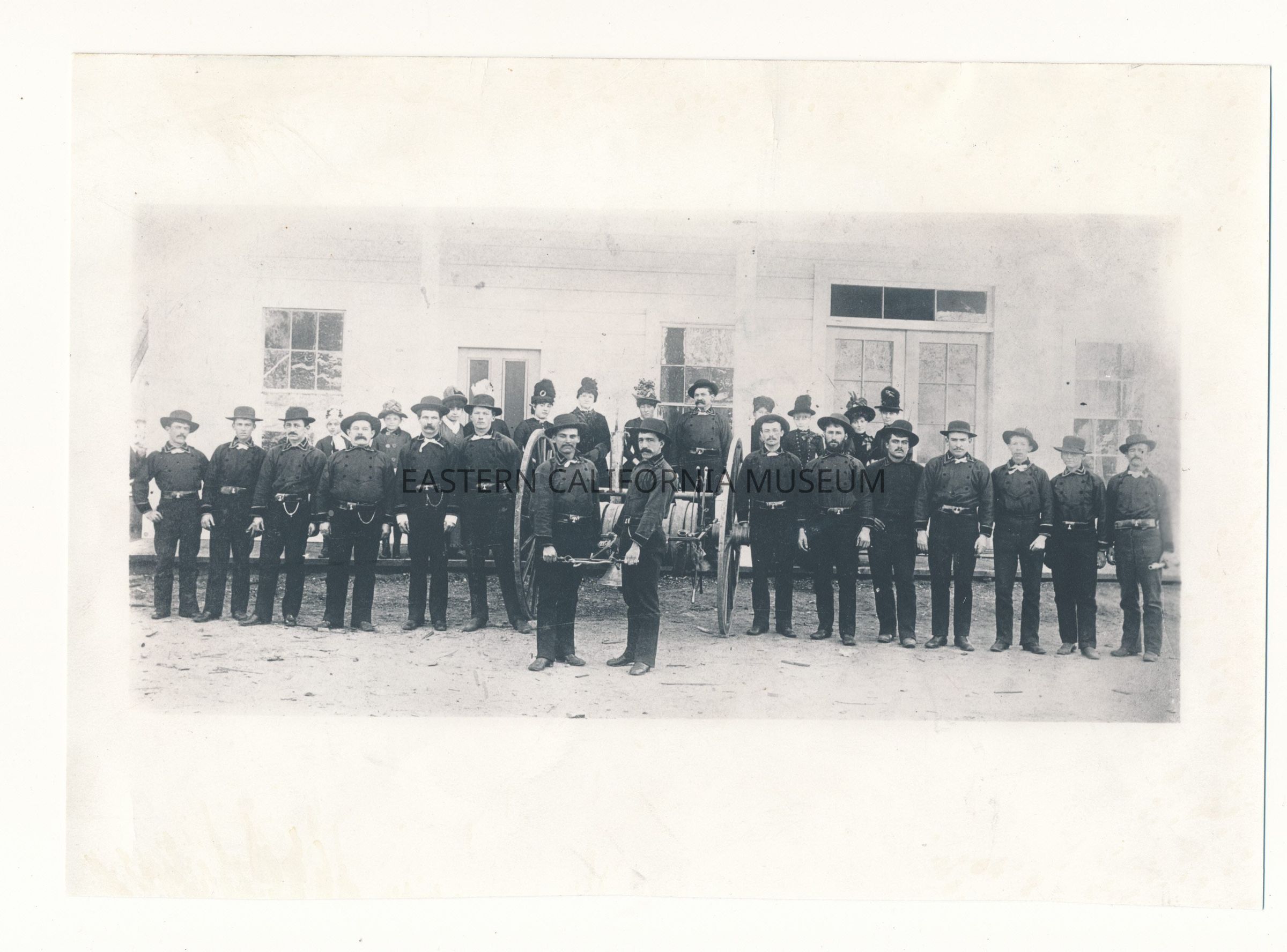 Copy of a photo of the Lone Pine Fire Brigade and hose cart. There are women and children standing in a row behind the members of the brigade.