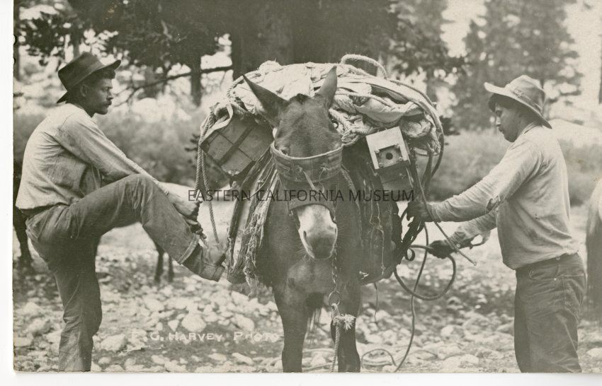 Photo postcard of two men securing a load to a pack mule. The man on left is Oscar Burkhardt and man on right is Horace Elder. Photo is by F. G. Harvey.
