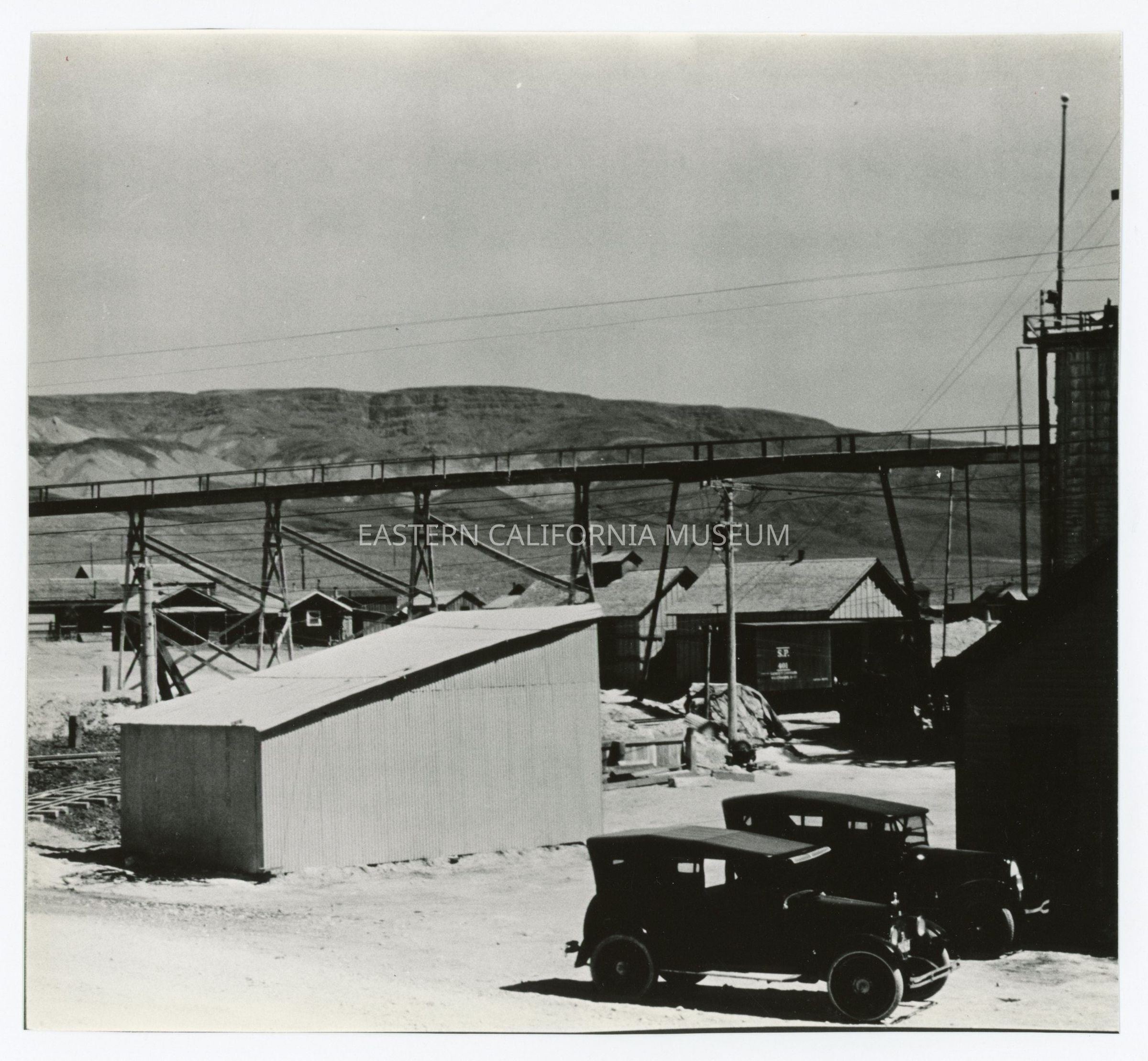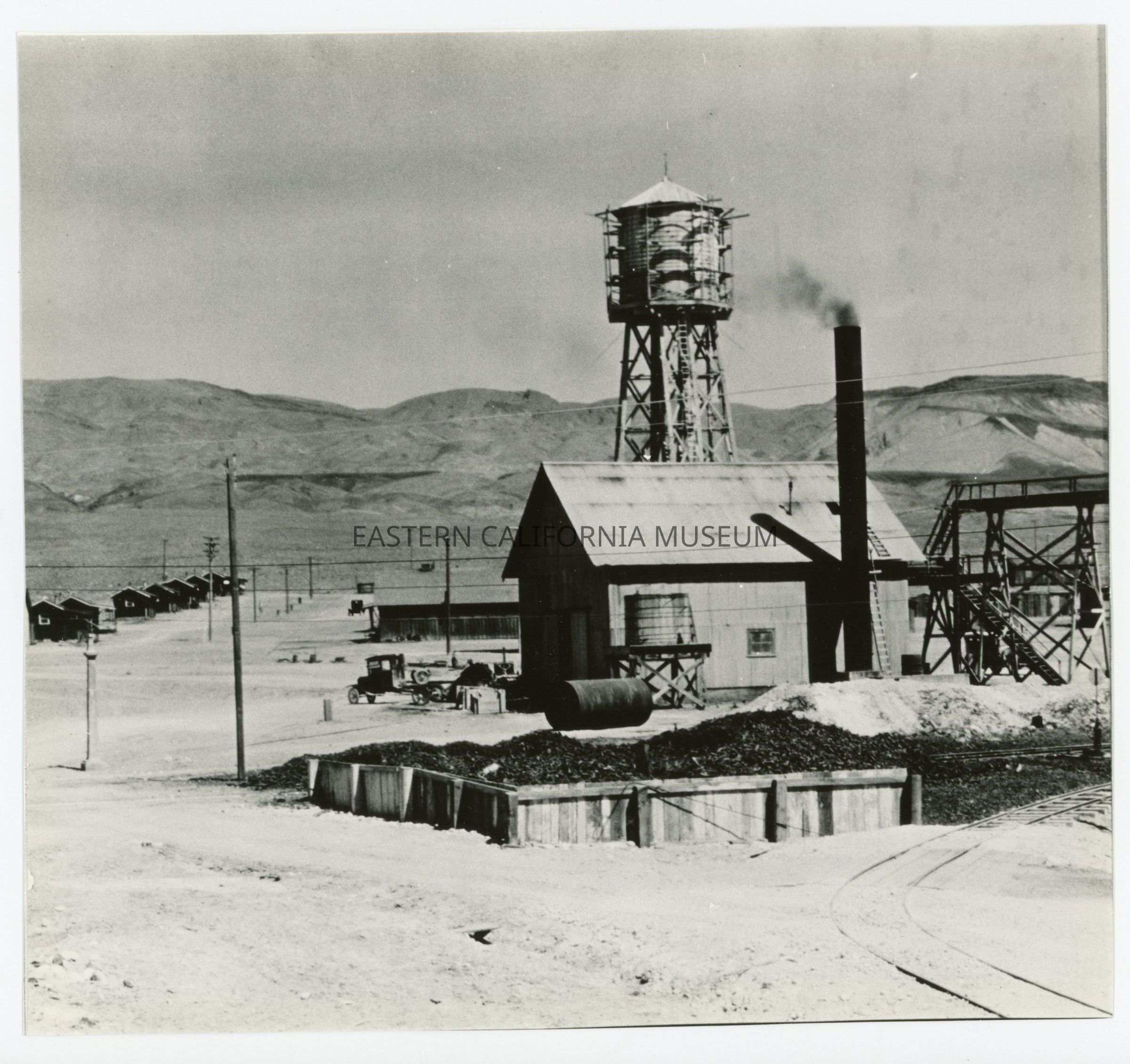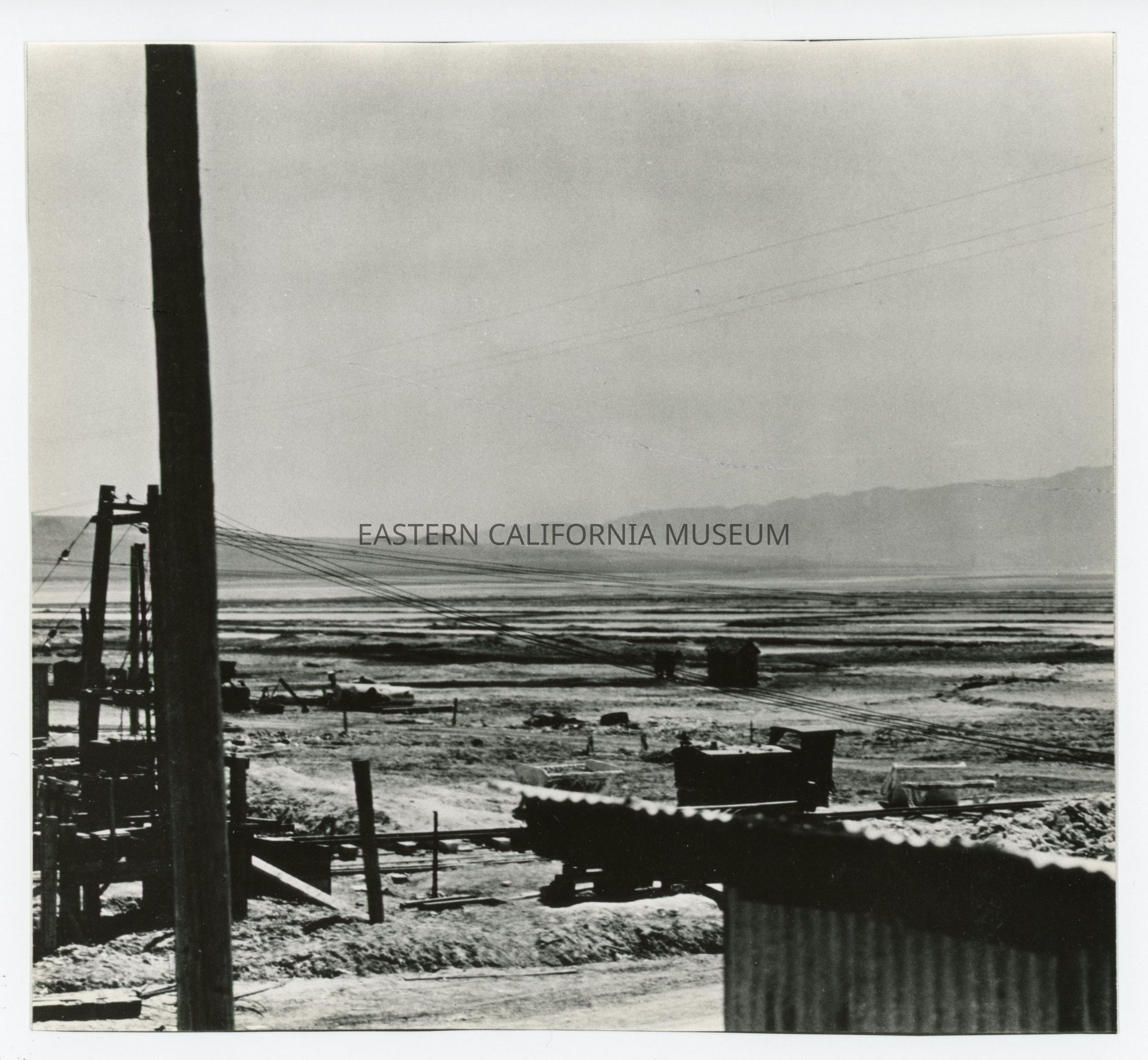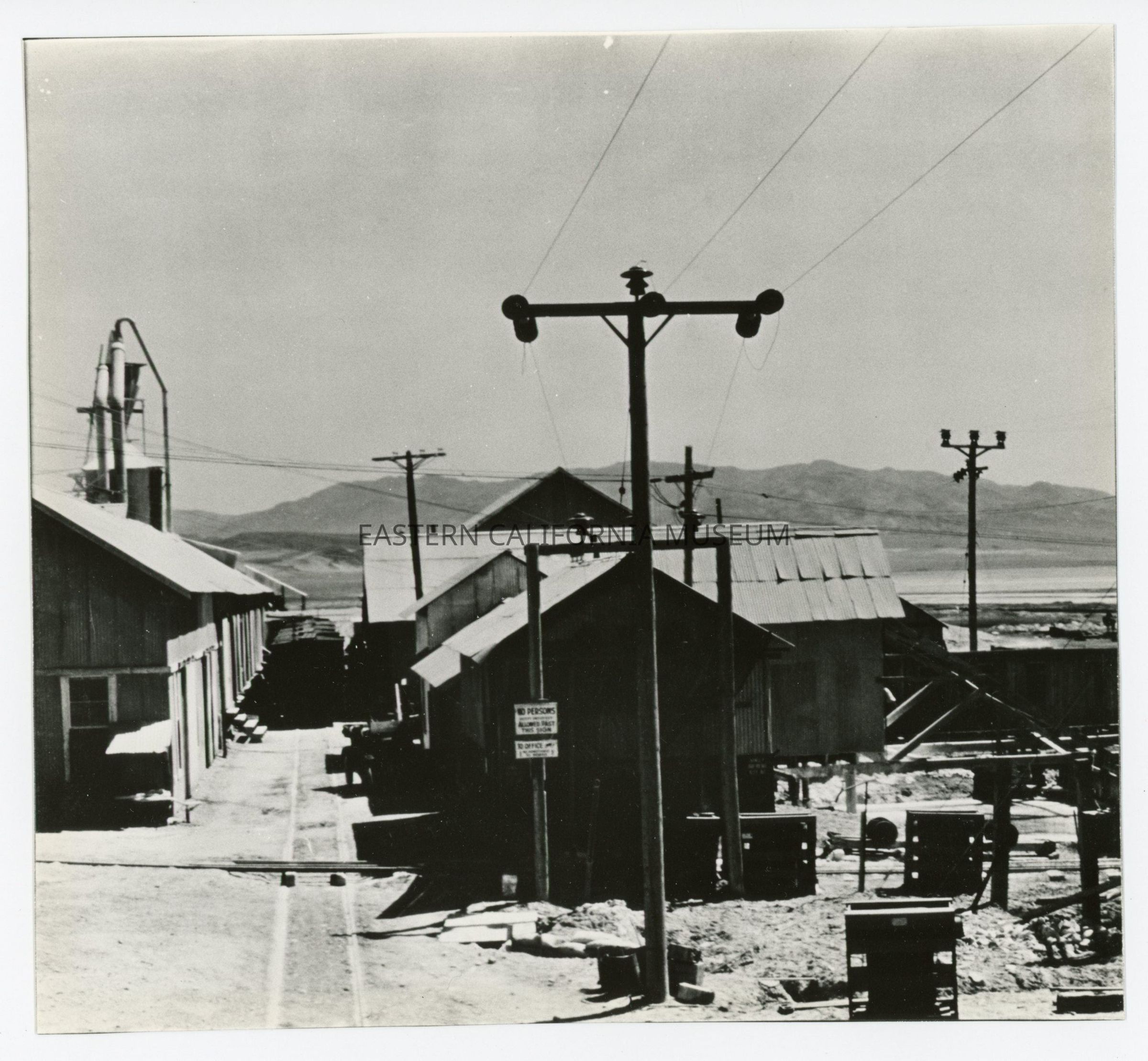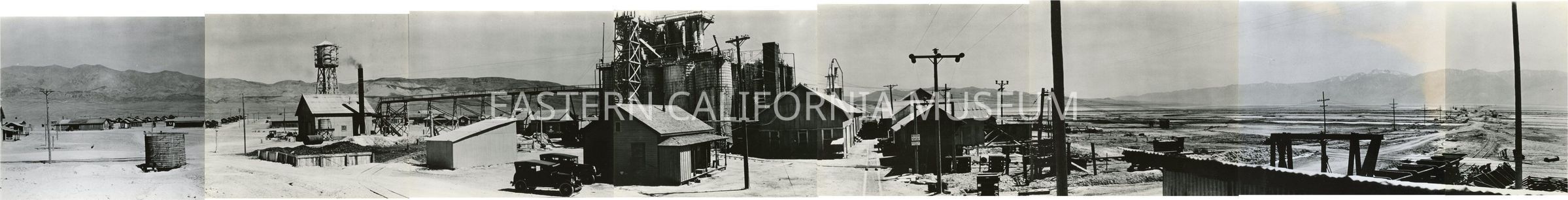 Eight individual prints that together form a panorama photo of the Natural Soda Products (NSP) plant near Keeler, CA. Original photo likely taken in the 1920s or 1930s and the photographer may have been Edwin W. Johnson (or Edwin W. Johnson, Jr.).Collection