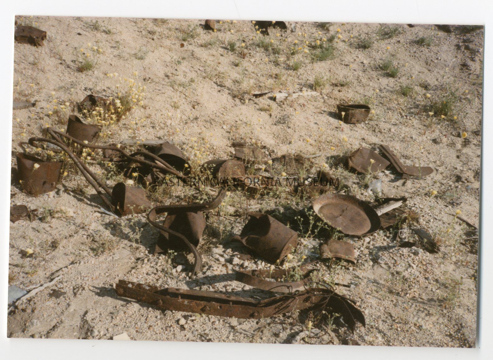 Color photo of a pile of rusty metal items on the ground at Manzanar.