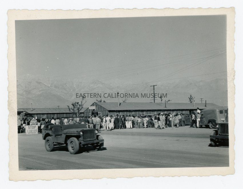 B/w photo of a large crowd at the Manzanar police building. Jeep in foreground.Photograph Details