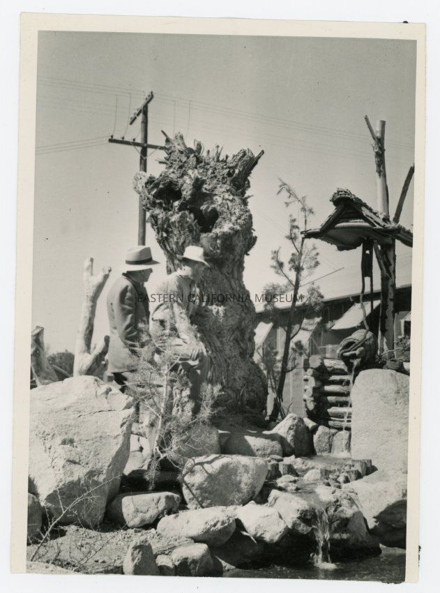 B/w photo of two men next to a tree stump and pile of boulders. Label says: Takeno [crossed out and replaced with Ogami] and Baker admiring the landscaping beside a Mess Hall.Photograph Details