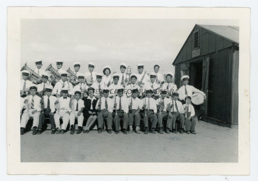 B/w photo of a band. Labels say: Manzanar Band, Director Melva Nielsen.Photograph Details