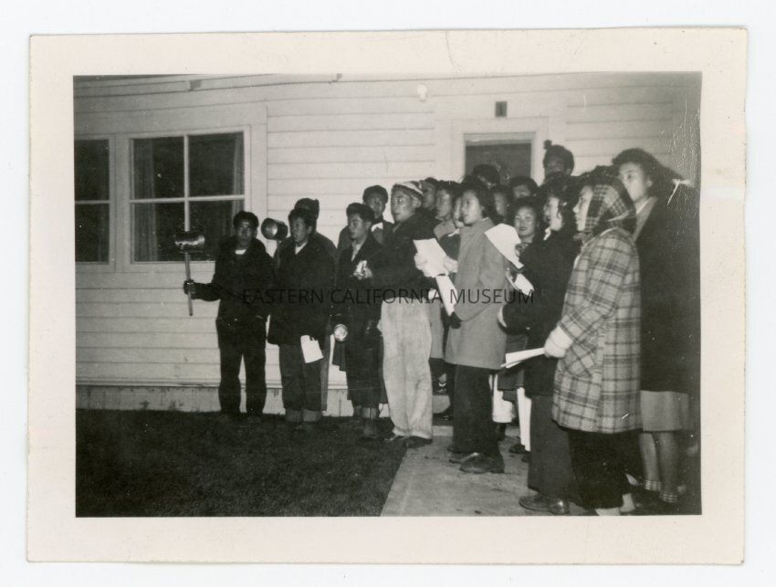 B/w photo of group of people singing. Label: Christmas carolers before the Project Director's house.Photograph Details