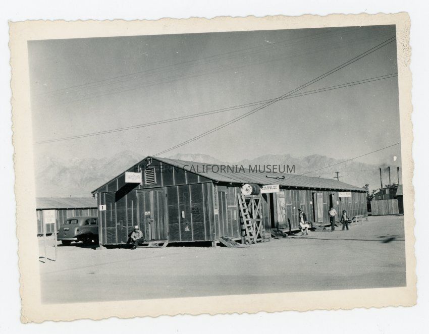 B/w photo of barrack at Manzanar, sign says "War Police and Ration Board."Photograph Details