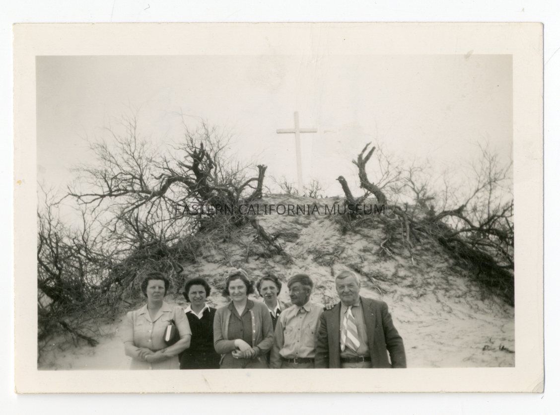 B/w photo of six people standing in front of a sand dune topped by a white cross [Crowley Monument?]. The man on the far right might be Felix Dombrowski.