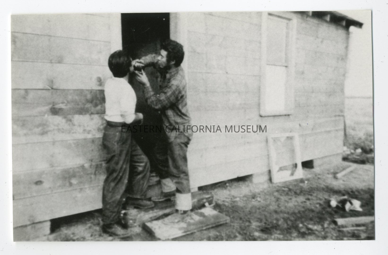 Copy of a photo of Shi Nomura and Yoji Ozaki in Idaho or Conrad, Montana in October 1942. They are working on the doorway of a wooden building. This copy was printed in April 1984.Collection