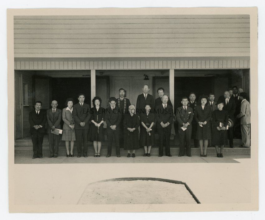 Photo of a group of people standing in front of the Manzanar auditorium. They are dressed somberly. Label: B/w photo taken during a memorial service for Sgt. Kiyoshi Robert Nakasaki and Pfc. Sadao "Spud" Munemori, killed in action in Italy, April 5, 1945.Photograph Details
