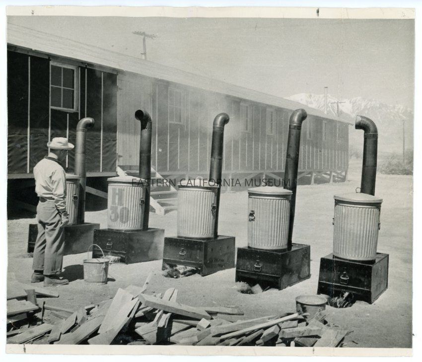 Photo of five trashcans on stoves at Manzanar.