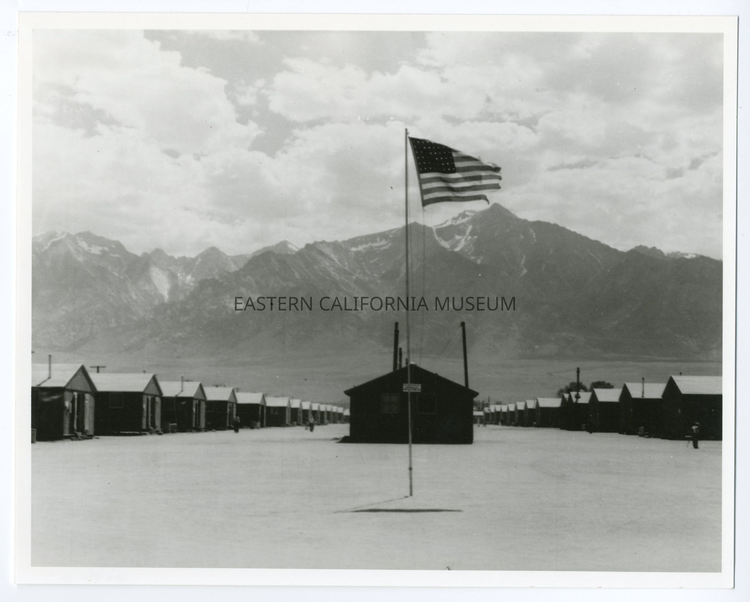 Copy of a b/w photo of Manzanar War Relocation Center. Shows an American flag flying in the center with rows of barracks stretching endlessly towards Mt. Williamson.Photograph Details