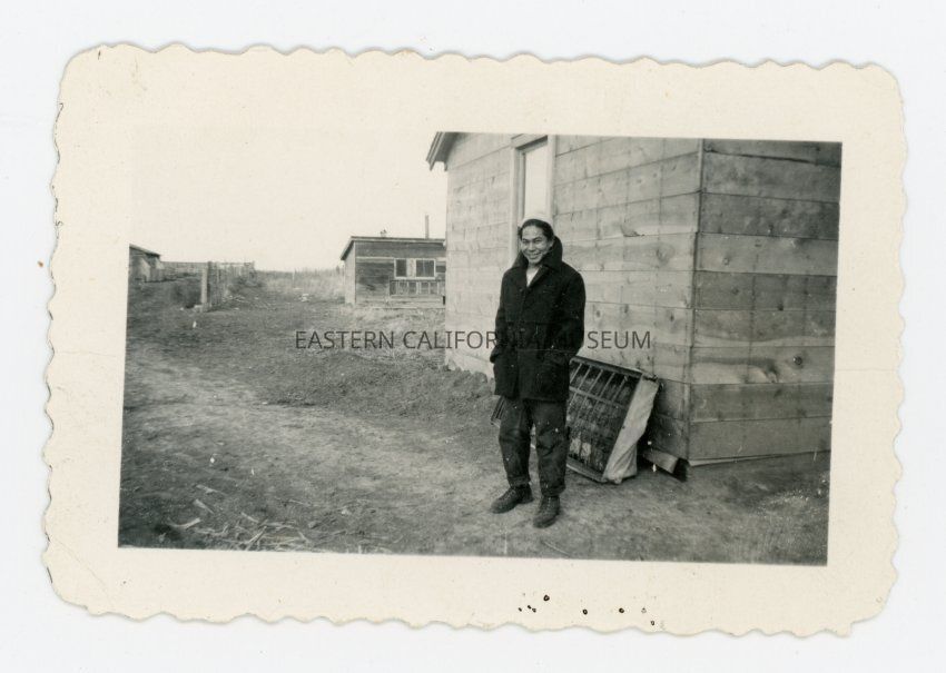 Unidentified Japanese-American man standing outside a wooden building in a winter coat, maybe in Idaho or Montana (picking beets?).