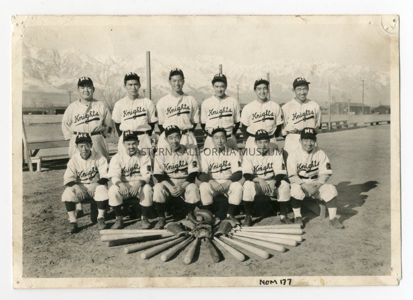 Exterior photograph of twelve young men in two rows, with the front row sitting. They are all wearing baseball uniforms with the name "Knights" on the front, and baseball caps with the letters "MK" (Manzaknights) on the front. In front of the men on the ground is a fan shaped display of twelve baseball bats and some mitts. In the background are some barracks, and a snow covered Sierra. A label beneath the photo identifies the team as "Class "A" Champs '43."Photograph Details