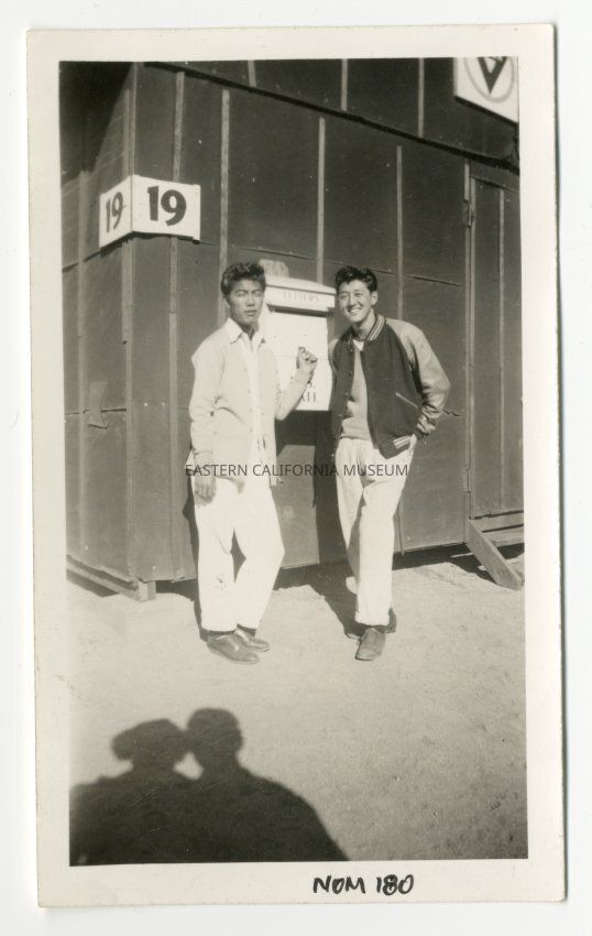 Exterior photograph of two young men standing next to a mailbox mounted on the side of a barracks building. The barracks has a sign with "19" on it. The men are members of the Manzaknights.Photograph Details